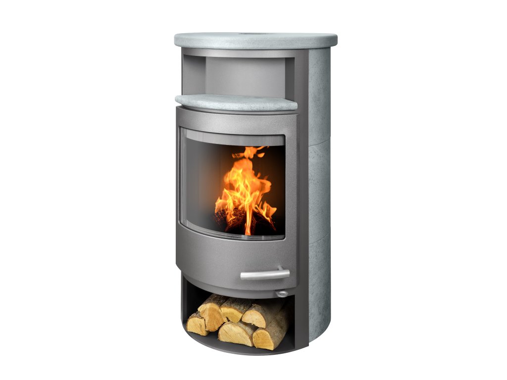 Krbová kamna ABX Apollo s obkladem z pískovce s úložným prostorem na dřevo.