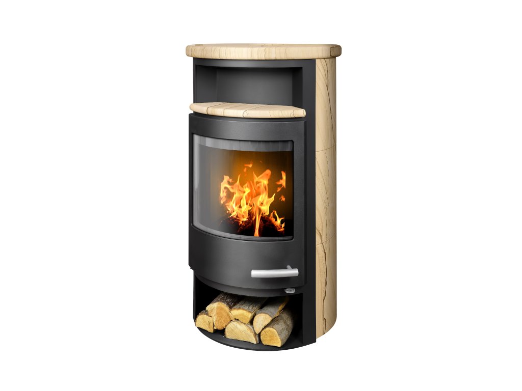 Krbová kamna ABX Apollo s obkladem z pískovce s úložným prostorem na dřevo.